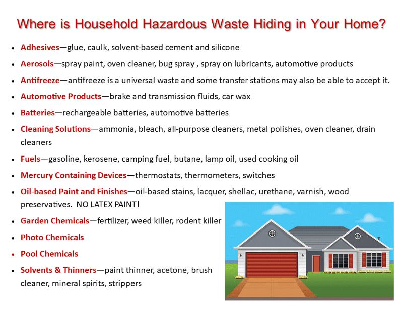 Household Hazardous Waste or HHW are products that contain corrosive, flammable, toxic, or reactive ingredients. HHW cannot be disposed of in the regular trash and must be brought to a designated HHW collection event. When HHW is improperly disposed of it can pollute water, threaten human health, and harm wildlife.